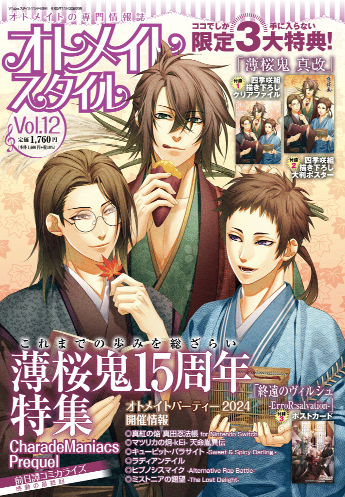11月30日(木)発売のオトメイトスタイル Vol.12は、「薄桜鬼 真改」より沖田、山南、山崎の3名が表紙を飾ります。